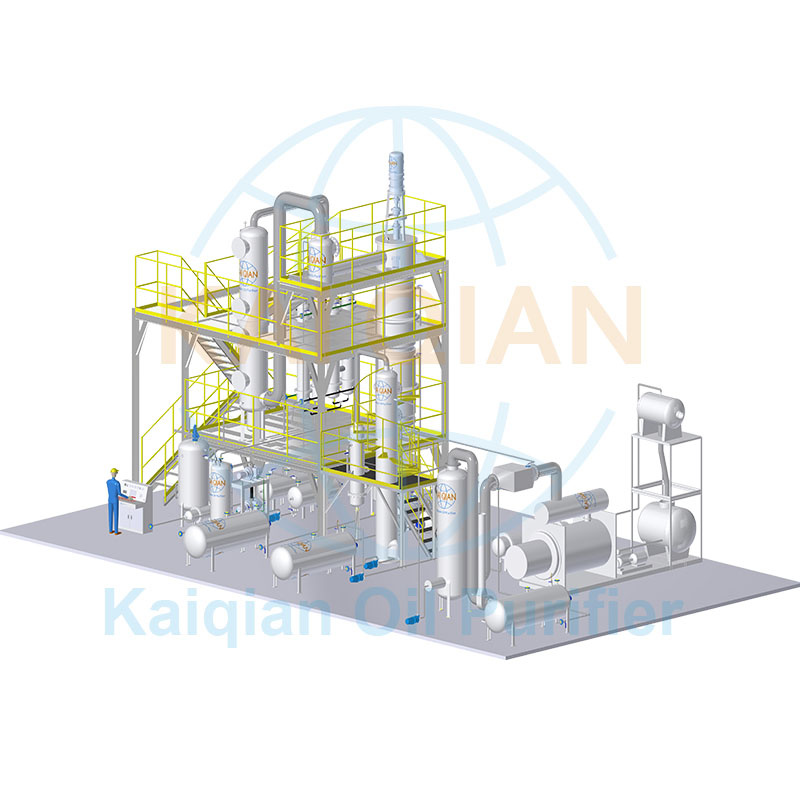 以废旧轮胎、废旧塑料热裂解处理的固体垃圾回收油品再利用的技术,已经在世界范围内得到快速推广,不但消除了部分固体白色垃圾对环境的污染,而且实现了能源的再生利用,但是废轮胎、废塑料热裂解后的毛油,大部分应用是作为热能燃料。因裂解过程中会产生炭黑,炭黑随着油气进入冷凝系统,故油品颜色较黑,杂质较多,且热值不高,利用率较低;而少数采用简单脱色沙对油品进行简易处理,此技术处理精度较低,加工过程中油品损失严重,而且脱色沙过后的油品化学性质不稳定,极容易被氧化,造成油品颜色变黑,杂质多,经济效益损失较大,可采用高真空精馏设备装置对塑料轮胎毛油精炼提纯得到更清洁透明的燃料油。